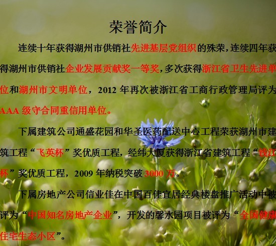 | 集團(tuán)一直圍繞著“關(guān)注生命,關(guān)注環(huán)境”的產(chǎn)業(yè)布局方針,做強(qiáng)做大以房地產(chǎn)為龍頭,建筑、裝飾、新型材料、貿(mào)易、為輔助產(chǎn)業(yè)的建筑產(chǎn)業(yè)鏈;做精做活以制藥、化工為重要產(chǎn)業(yè)布局的新興產(chǎn)業(yè)鏈。公司連續(xù)多年被評(píng)為浙江省重合同守信用單位,連續(xù)13年被評(píng)為湖州市供銷社本級(jí)企業(yè)發(fā)展貢獻(xiàn)獎(jiǎng)一等獎(jiǎng),并多次獲得浙江省優(yōu)秀民營企業(yè),全省供銷社50強(qiáng)企業(yè),供銷社系統(tǒng)先進(jìn)基層黨組織等榮譽(yù)稱號(hào)。 |